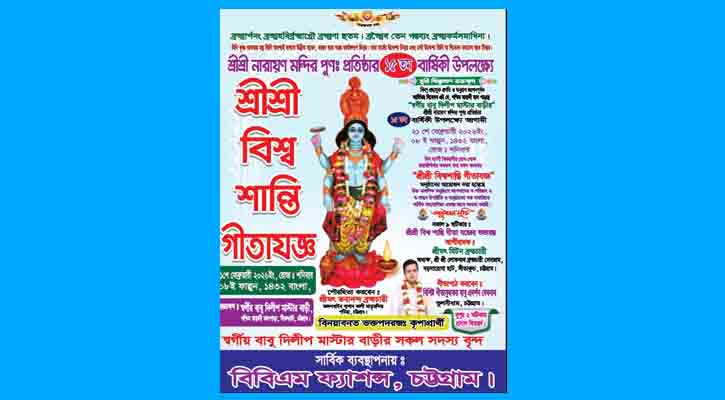 খবর বিজ্ঞপ্তি: শ্রীশ্রী নারায়ণ মন্দির পুণঃ প্রতিষ্ঠার ১৫ তম বার্ষিকী উপলক্ষ্যে মিরসরাই পশ্চিম মায়ানী মালপাড়াস্থ স্বর্গীয় দিলীপ মাস্টার বাড়ী প্রাঙ্গনে আগামী ২১ ফেব্রুয়ারী শনিবার বিশ্ববাসীর রোগ-শোক জরাজীর্ণতার অবসানে দিনব্যাপী ‘শ্রীশ্রী