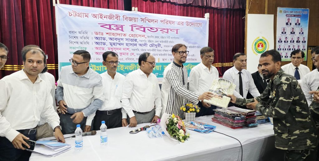 নিজস্ব প্রতিবেদক: চট্টগ্রাম আইনজীবী বিজয়া সম্মিলন পরিষদের উদ্যোগে আইনজীবী অডিটরিয়ামে প্রতিবারের ন্যায় সমিতির কর্মচারী ও এতিম, দুস্থ এবং দরিদ্রদের মাঝে বস্ত্র বিতরণ করা হয়। আজ রোববার উক্ত বস্ত্র বিতরণ অনুষ্ঠানে প্রধান অতিথি হিসেবে উপস্থিত ছিলেন চট্টগ্রামের সিটি মেয়র ডা. শাহাদাত হোসেন। আইনজীবী বিজয়া সম্মিলন পরিষদের নব নির্বাচিত সভাপতিএডভোকেট মধুসূদন দাশ এর সভাপত্বিতে এবং নব নির্বাচিত সাধারণ সম্পাদক এডভোকেট শিপন কুমার দে এর সঞ্চালনায় বস্ত্র বিতরণ অনুষ্ঠানে শুভেচ্ছা বক্তব্য রাখেন সিনিয়র আইনজীবী যথাক্রমে রফিক আহমদ, জিয়া হাবীব আহসান, দিনমনি দে, শংকর প্রসাদ দে, তুষার সিংহ হাজারী, সমীর দাশগুপ্ত। এতে আরোও উপস্থিত ছিলেন মহানগর পিপি মো. মফিজুল হক ভূঁইয়া, জিপি মোহাম্মদ কাসেম চৌধুরী, চট্টগ্রাম আইনজীবী বিজয়া সম্মিলন পরিষদের সাবেক সভাপতি নিতাই প্রসাদ ঘোষ, লিটন কান্তি গুহ, সাবেক সাধারণ সম্পাদক যথাক্রমে চন্দন বিশ্বাস, উত্তম দত্ত, চট্টগ্রাম আইনজীবী বিজয়া সম্মিলন পরিষদের সাবেক সমন্বয়কারী চন্দন তালুকদার, বিবেকানন্দ চৌধুরী, রুপম কুমার ভট্টাচার্য্য, বর্তমান সমন্বয়কারী রক্তিম চন্দ্র নাথ সহ এডভোকেট প্রতীক কুমার দেব, দিলীপ চৌধুরী, ফৌজুল আমিন চৌধুরী, মো. কাসেম কামাল, মোহাম্মদ আনোয়ার হোসেন, হাসান মাহমুদ চৌধুরী, মো. দেলোয়ার, মো. জাহেদ, মো. তুহিন, নিজাম উদ্দিন, আবু তাহের, আলী আকবর সানজিক, নাজমুল হাসান সিদ্দিকী, বদরুল রিয়াজ, জালাল উদ্দিন পারভেজ, দীর্ঘতম বড়ুয়া, যিশু কান্তি দাশ, সুব্রত শীল রাজু, পান্না দাশ, টিপু শীল জয়দেব, পঙ্কজ কান্তি দে, ছোটন বোস,অর্পিতা দাশ, শুভ্রা দাশ, পলি ঘোষ, সুসজ্জিতা দাশসহ বিপুল সংখ্যক আইনজীবী।